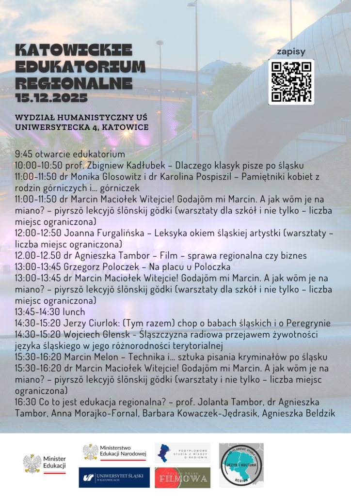 Już 15 grudnia 2025 zapraszamy na Katowickie Edukatorium Regionalne – wydarzenie łączące naukę, kulturę i edukację regionalną w żywe, wielopokoleniowe spotkanie. Przez cały dzień uczestnicy – uczniowie, nauczyciele, studenci, edukatorzy, a także mieszkańcy regionu będą mogli uczestniczyć w rozmowach o języku i kulturze, panelach dyskusyjnych i wykładach, których wspólnym mianownikiem jest śląska tożsamość. Wszystko po to, by pokazać, że edukacja regionalna to nie obowiązek, ale przywilej i okazja do pogłębienia więzi z miejscem, w którym się żyje.